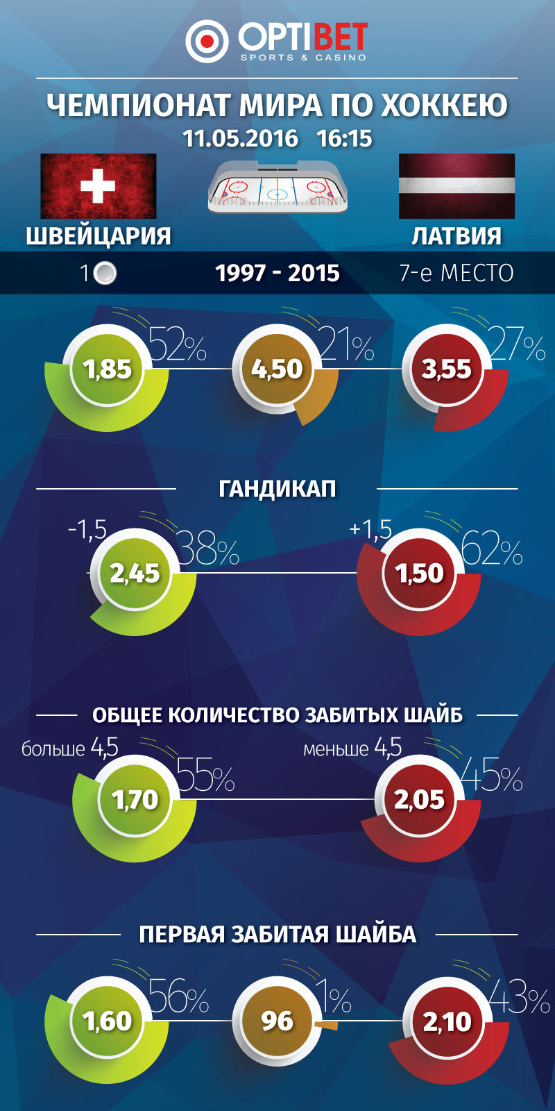 Вместе с букмекерами Optibet мы подготовили инфографику, в которой можешь посмотреть некоторые коэффициенты на победу, а также процентное соотношение вероятностей каждой из команд.